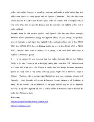 This document summarizes key differences between Starbucks and Highland Coffee in Vietnam. Starbucks aims to inspire people globally with its mission, while Highland Coffee focuses on customers in Vietnam. Starbucks uses exclusively Arabica beans imported from abroad, while Highland Coffee uses both Robusta from Vietnam and some Arabica. Starbucks tailors its seasonal drinks to different markets, while Highland Coffee focuses on traditional Vietnamese tastes. Starbucks follows a differentiation strategy with higher prices targeting all customers, versus Highland Coffee's lower cost strategy targeting Vietnamese customers. The main difference is price, as Starbucks is currently more expensive than what many Vietnamese can afford.