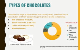 The document discusses chocolate packaging trends in India. It finds that the Indian chocolate market is growing at 15% annually, with per capita consumption rising from 0.05kg to 0.12kg from 2005 to 2013. Most chocolate is consumed in urban areas by children and young adults. The top organized chocolate companies hold 92% of the market share. Popular packaging includes foil wrappers, plastic pouches, and flow wrapping in paper or plastic. New innovations include biodegradable plastic trays and 3D chocolate printing.