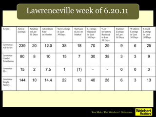 The document provides real estate data for the towns of Lawrenceville, West Windsor, and Ewing for the week of June 20, 2011. It includes information on active listings, pending sales in the last 30 days, months of inventory, new and closed listings, as well as other metrics for all property styles and subsets of condos, townhomes, and single family homes in each town.