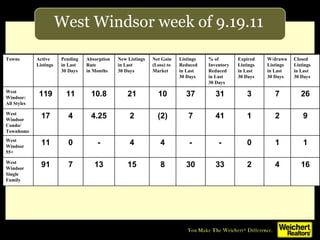 The document provides real estate data for different housing styles in Lawrenceville and West Windsor for the week of September 19th, 2011, including the number of active listings, pending sales, absorption rate, new listings, price reductions, expired listings, and closed sales. It compares this data for all housing styles as well as for single family homes, condos/townhomes, and homes catered to those aged 55 and up in both towns.
