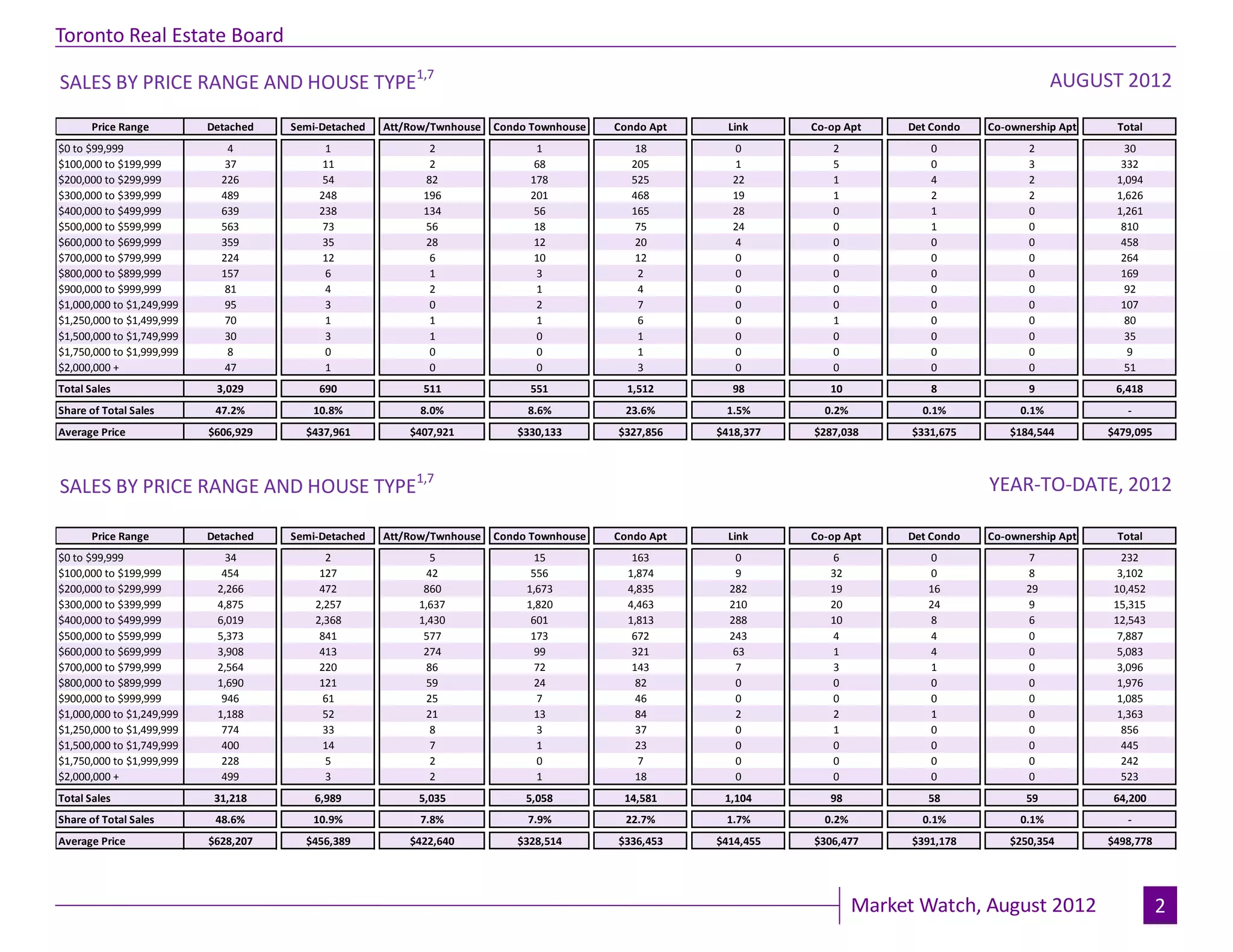 - The average selling price in August 2012 was up 6.5% compared to August 2011, driven by a 15% increase in prices of single detached homes in Toronto.