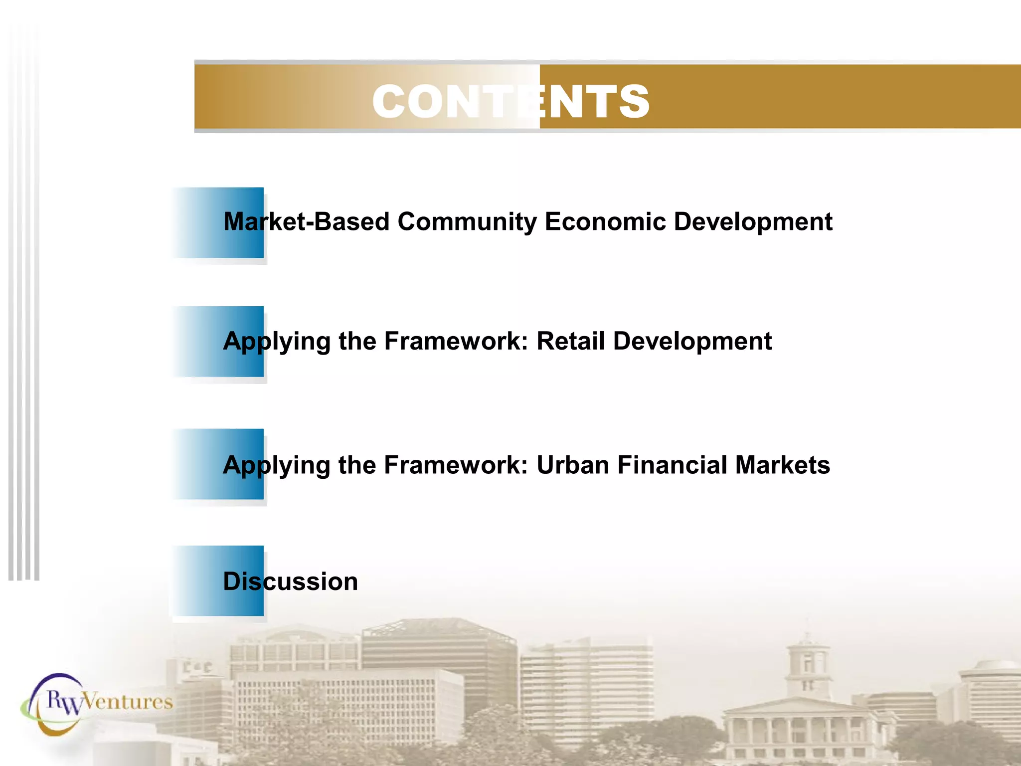 This document outlines a framework for using market-based approaches to community economic development. It argues that markets can be leveraged to invest in undervalued assets in low-income communities. The framework involves: