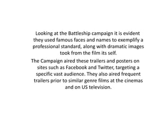 The Battleship film campaign used famous actors and dramatic images from the film in trailers and posters on social media sites like Facebook and Twitter to promote it to a broad audience. They also aired frequent trailers before similar genre films in theaters and on television in the US. Film trailers are made to create awareness and interest in a new film so that people will want to see it when it is released. They are snippets of clips and scenes from the film with titles and audio edited together, usually a few minutes long. Trailers are shown on TV and before other movies in theaters, often before films of the same genre, to reach the intended target audience. They are generally released 1-2 months before the film to build interest