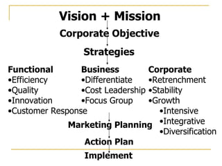 Marketing 1. 2. Vision + Mission Corporate Objective Strategies Functional Efficiency Quality Innovation Customer Response Business Differentiate Cost Leadership Focus Group Corporate Retrenchment Stability Growth Intensive Integrative Diversification Marketing Planning Action Plan Implement 3. Strategic Analysis External Analysis Customer Analysis Competitor Analysis Market Analysis Environment Analysis Internal Analysis Performance Analysis Determinant of strategic option SWOT Identification & Selection strategies Product Investment Strategies Functional Area Strategies Select Strategies Implement Review Strategies 4. แผนการตลาดประกอบด้วย 1. การวิเคราะห์ 3C 1M M: market Attractiveness Size, Growth, Profit, Trend เครื่องมือที่ใช้ในการวิเคราะห์ ได้แก่ SPEELT C1: Customer Customer Profile พฤติกรรมการซื้อ ความต้องการ ปัจจัยในการตัดสินใจซื้อ พฤติกรรมด้านสื่อ ภาพลักษณ์ของสินค้า 5. 6. 2. การพยากรณ์อนาคต Market Size โอกาส ภัยคุกคาม การเปลี่ยนแปลงต่างๆ เช่น ความต้องการ รสนิยม เป็นต้น 3. การกำหนดวัตถุประสงค์ & เป้าหมาย กำหนดทั้งในระยะยาวและระยะสั้น งานหลัก เป็นการกำหนด Performance ยอดขาย ความพึงพอใจ กำไร 7. กำหนด KPI การขาย กำหนดจำนวนขาย จำนวนเงิน หรือ market share กำไร กำหนดเป็นอัตราส่วนต่างๆ เช่น ROA ROE ความพึงพอใจ กำหนดด้วยจำนวนครั้งของการร้องเรียน หรือจำนวนการซื้อซ้ำ ROA กำไร จำนวนการร้องเรียน ความพึงพอใจ % Market Share จำนวนเงิน ยอดขาย เป้าหมาย ปัจจุบัน KPI งานหลัก 8. 4. การกำหนดกลยุทธ์ STP Segmentation การแบ่งกลุ่มลูกค้าตามลักษณะต่างๆ Geographic ตามภูมิภาค Demographic ตามลักษณะทางประชากร Psychological ตามลักษณะการดำเนินชีวิต Behavior ตามพฤติกรรม Target เป็นการกำหนดลูกค้าเป้าหมาย Positioning เป็นการกำหนดตำแหน่งทางการตลาดที่เราเหนือกว่าคู่แข่ง 9. 4 P’s Product เป็นการกำหนดกลยุทธ์เกี่ยวกับสินค้า เช่น ความหลากหลาย คุณภาพ รูปแบบ ตราสินค้า เป็นต้น Price เป็นการกำหนดกลยุทธ์ทางราคา มีจุดประสงค์เพื่อ เจาะตลาด และเพิ่มส่วนแบ่งทางการตลาด Skimming Pricing Target Profit Pricing Promotion Pricing เพื่อความอยู่รอด 10. Place เป็นช่องทางการตลาด โดยตรง ทางอ้อม Promotion Advertising เช่น โทรทัศน์ หนังสือพิมพ์ วิทยุ เป็นต้น Personal Selling เช่น พนักงานขาย Sale Promotion Public Relation Direct Marketing เช่น Mail Telephone Internet 11. 5. Action Plan กำหนดกิจกรรมที่จะทำ กำหนดระยะเวลา กำหนดผู้รับผิดชอบ กำหนดงบประมาณ 6.Implement ติดตามผล เปรียบเทียบ Planned กับ Actual Evaluation Corrective ทำแผนฉุกเฉิน 12. 7. Profit & Loss Projection ทำเพื่อเปรียบเทียบสิ่งที่พยากรณ์ไว้ในงบการเงิน 8. Executive Summary เป็นการแสดงภาพรวมของสิ่งที่ทำมา รวมทั้งการเสนอข้อแนะนำ 13. 14. Personal อายุ อาชีพ การดำเนินชีวิต ลักษณะส่วนบุคคล Psychological แรงจูงใจ การรับรู้ การเรียนรู้ ความเชื่อ ทัศนคติ 15. Buying Roles Initiator เป็นผู้คิดที่จะซื้อ Influencer เป็นผู้มีอิทธิพลในการตัดสินใจในการซื้อ Decider เป็นผู้ทำการตัดสินใจซื้อ Buyer เป็นผู้ซื้อสินค้า User เป็นผู้ใช้สินค้า 16. 17. 18. Stars Market Growth Relative Market Share Dogs Cash Out น้อย Cash In น้อย เปลี่ยนผลิตภัณฑ์ , เปลี่ยนธุรกิจหรือเก็บเกี่ยวผลประโยชน์ Divest & harvest Strategy Cash cows Cash Out น้อย Cash In มาก รักษา + สร้างส่วนแบ่งตลาด Build and Hold Strategy Question marks Cash Out มาก Cash In ต่ำ ใช้กล