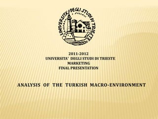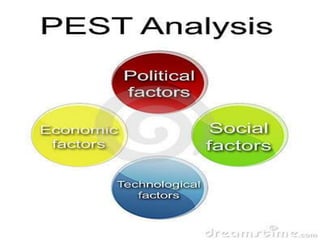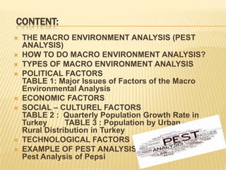 This document provides an analysis of the macro environment in Turkey using the PEST framework. It begins with an introduction to macro environmental analysis and the PEST method. It then examines the political, economic, social-cultural, and technological factors affecting Turkey. For each factor, it provides examples and data like population growth rates and urbanization trends. It concludes with an example PEST analysis of Pepsi to demonstrate how the framework can be applied.