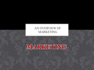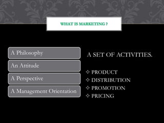 This document provides an overview of marketing. It defines marketing as a management orientation, set of activities, and philosophy. The key marketing activities are product, distribution, promotion, and pricing. Marketing is defined by the American Marketing Association as the process of creating and delivering value for customers. Studying marketing is important because it plays a vital role in business and society, and affects consumers' daily lives. It also offers many career opportunities.