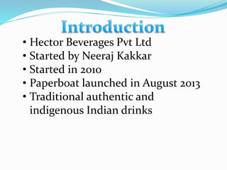 This document discusses Hector Beverages Pvt Ltd, the company that launched Paperboat beverages in 2013. It summarizes that Paperboat offers traditional Indian drinks and sources ingredients locally. It has two manufacturing facilities and plans to produce a new drink using fermented purple carrots. The document also outlines Paperboat's product lines, marketing strategy, pricing, segmentation, targeting, positioning, retailer insights, flavor sales, SWOT analysis, beverage industry forecasts, and the company's financial projections.