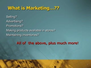 Marketing involves planning and executing ideas, products and services to create value for customers. It includes conception, pricing, promotion and distribution to satisfy individual and organizational goals. Marketing management is the process of choosing target markets and creating, delivering and communicating superior customer value. The core concepts of marketing are understanding customer needs, wants, demands and desires and delivering products and services that provide utility, value and satisfaction.
