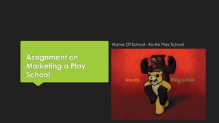 This document provides a marketing plan for a new play school called Ko-Ke Play School. It identifies the target audience as stay at home and dual working parents. It discusses determining parents' requirements and willingness to enroll their children. Location and low-cost marketing tactics like flyers and newspaper ads are addressed. Partnerships with local businesses, corporations, and real estate agents are suggested. The plan also covers developing the school's image, distinguishing its offerings, educational system, facilities, transportation, and parental rights policies. Pricing strategies are discussed to be affordable but not degrade the school. The plan aims to deploy these tactics to gain better business over time through good service.