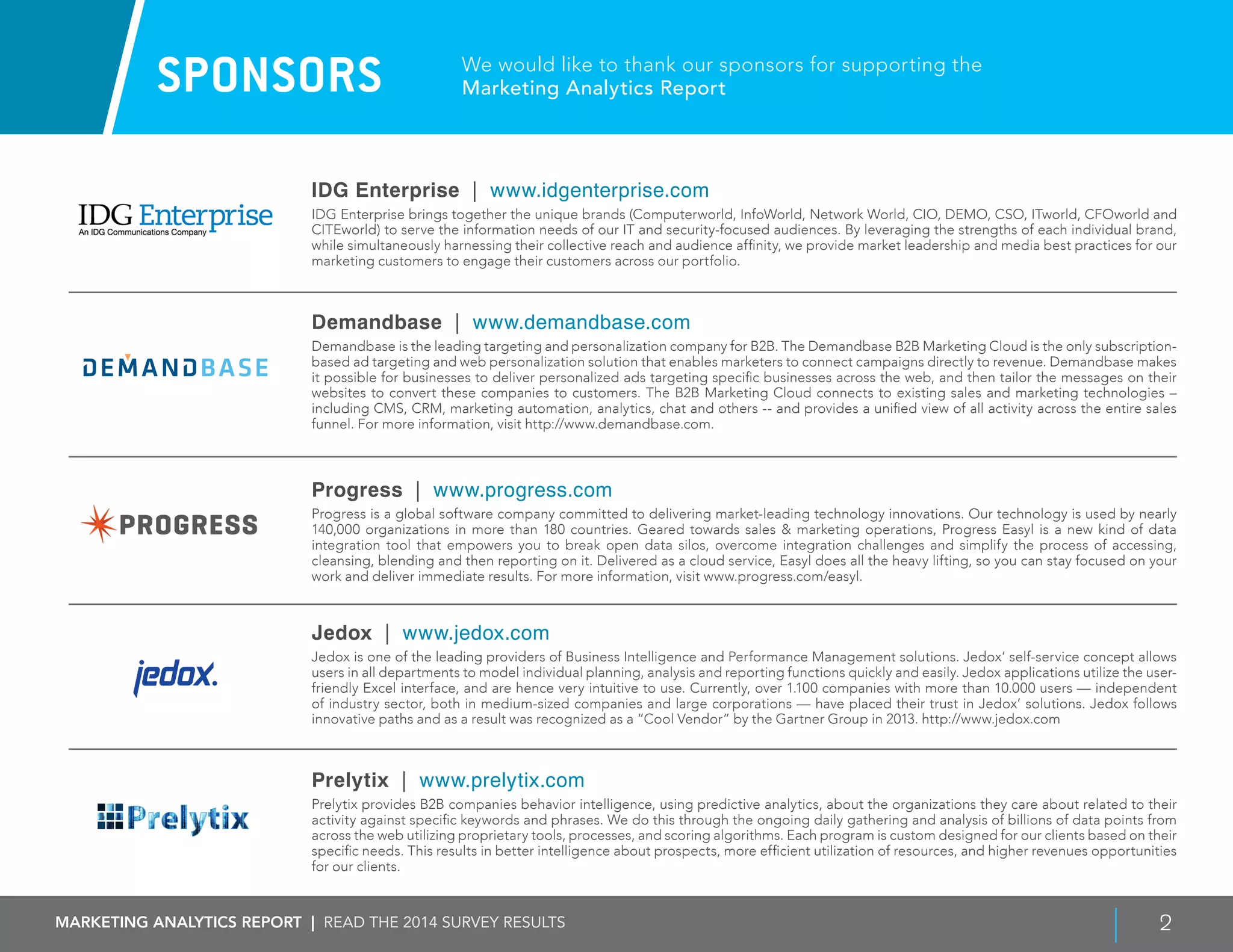 The 2014 Marketing Analytics Report reveals insights from over 500 marketing professionals regarding the goals, challenges, and effectiveness of marketing analytics. Key findings indicate that marketers prioritize understanding ROI, improving messaging, and demonstrating marketing value to sales, but face challenges like data quality and resource limitations. Budgets for marketing analytics are expected to grow, with a significant reliance on tools like Google Analytics and Excel.