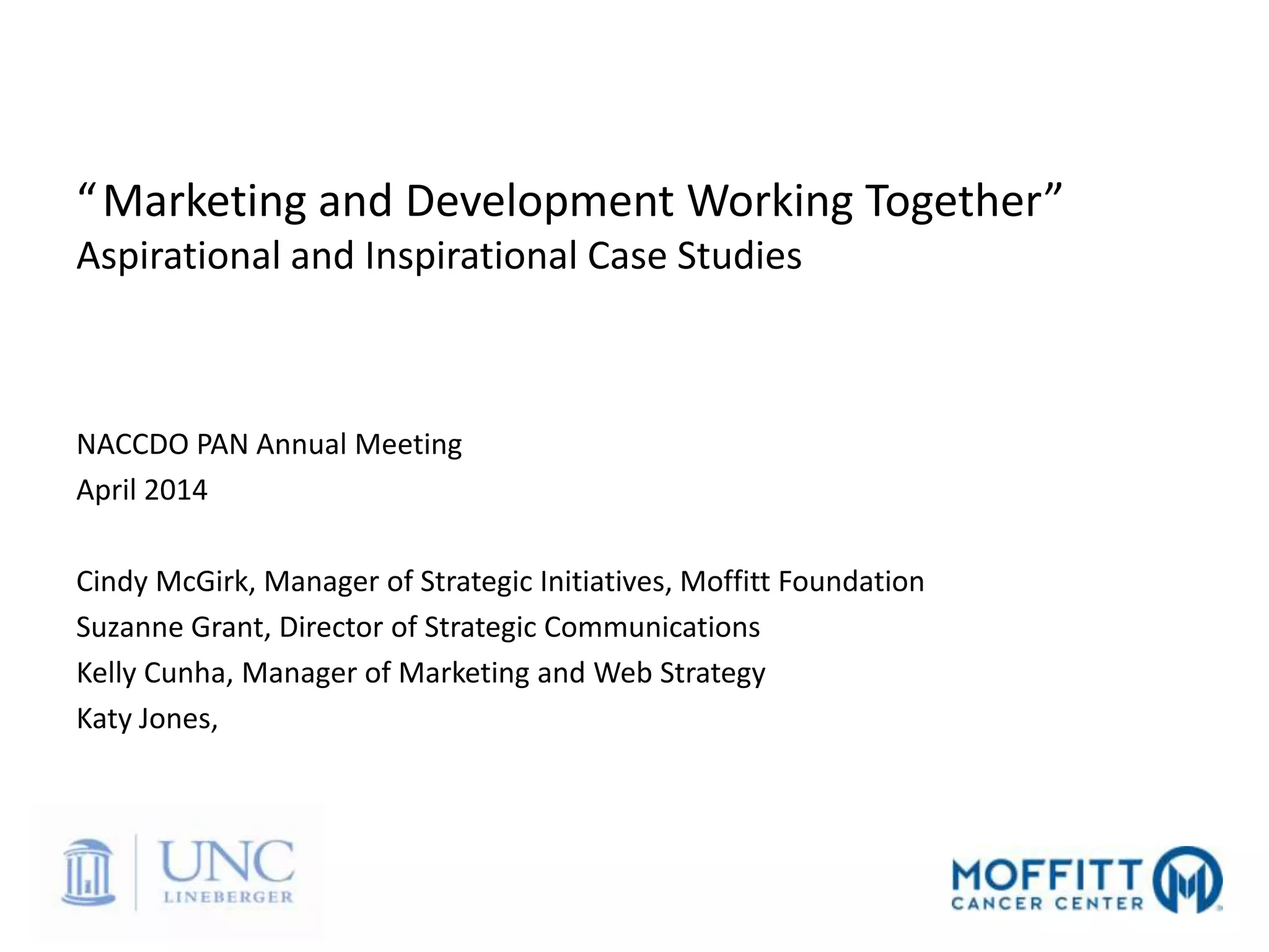 This document outlines how marketing and development teams can better work together. It discusses conducting an audit of current efforts, developing an effective case statement and campaign in a collaborative way, and defining roles and communication. Key recommendations include planning together early, agreeing on goals before tactics, valuing different expertise, setting honest deadlines, and ensuring open communication to build trust. The presentation provides examples and lessons learned from case studies to illustrate how strategic alignment can strengthen outcomes.