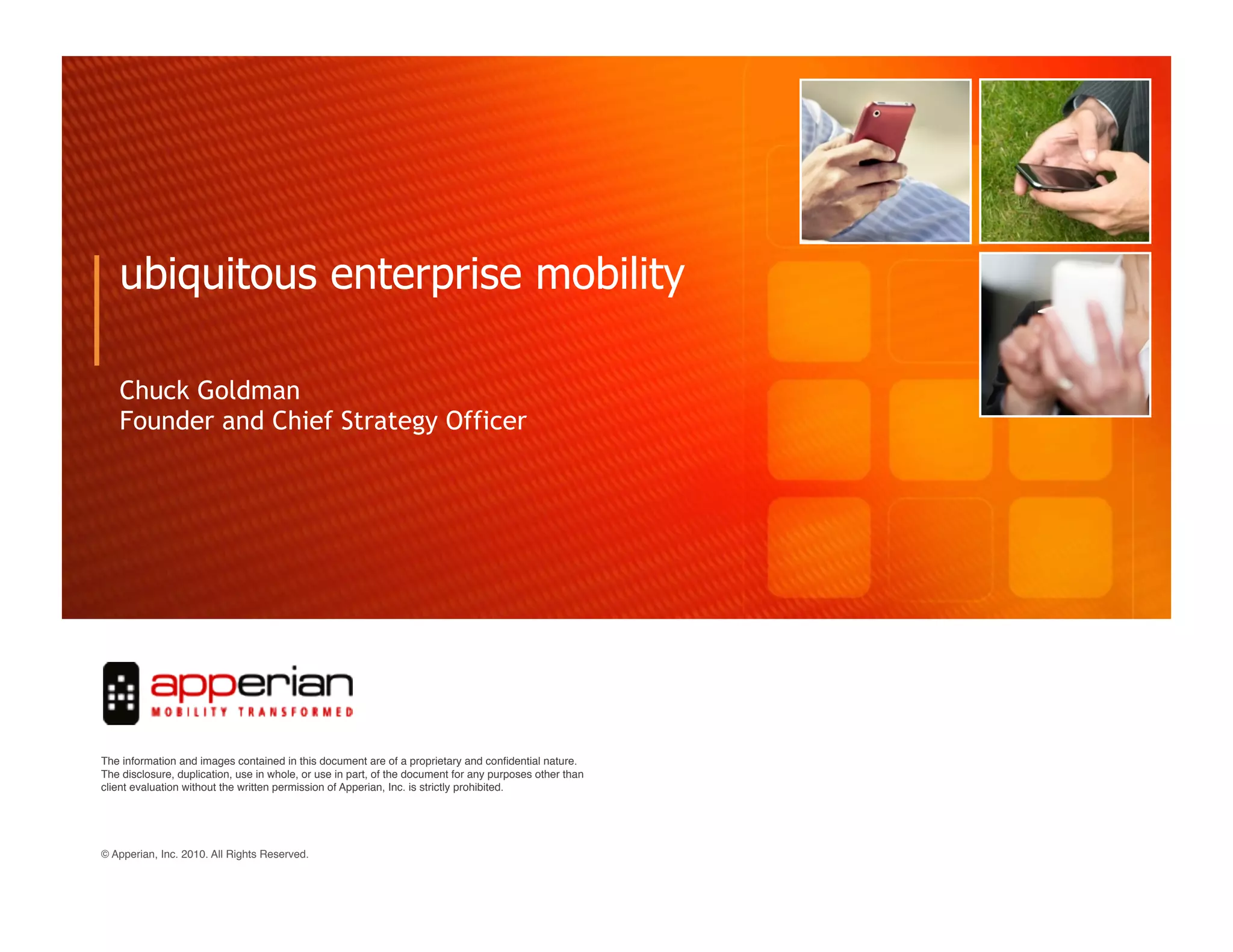 Chuck Goldman, founder and chief strategy officer of Apperian, discusses ubiquitous enterprise mobility and the business opportunities it enables. He outlines the growth of the enterprise mobile market and need for mobile application management. Goldman then describes how enterprises are using internal mobile apps for sales, productivity, and service delivery purposes. He presents Apperian's Enterprise App Services Environment (EASE) platform for securely publishing and managing internal mobile apps across devices.