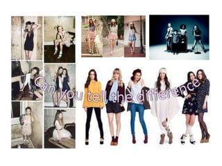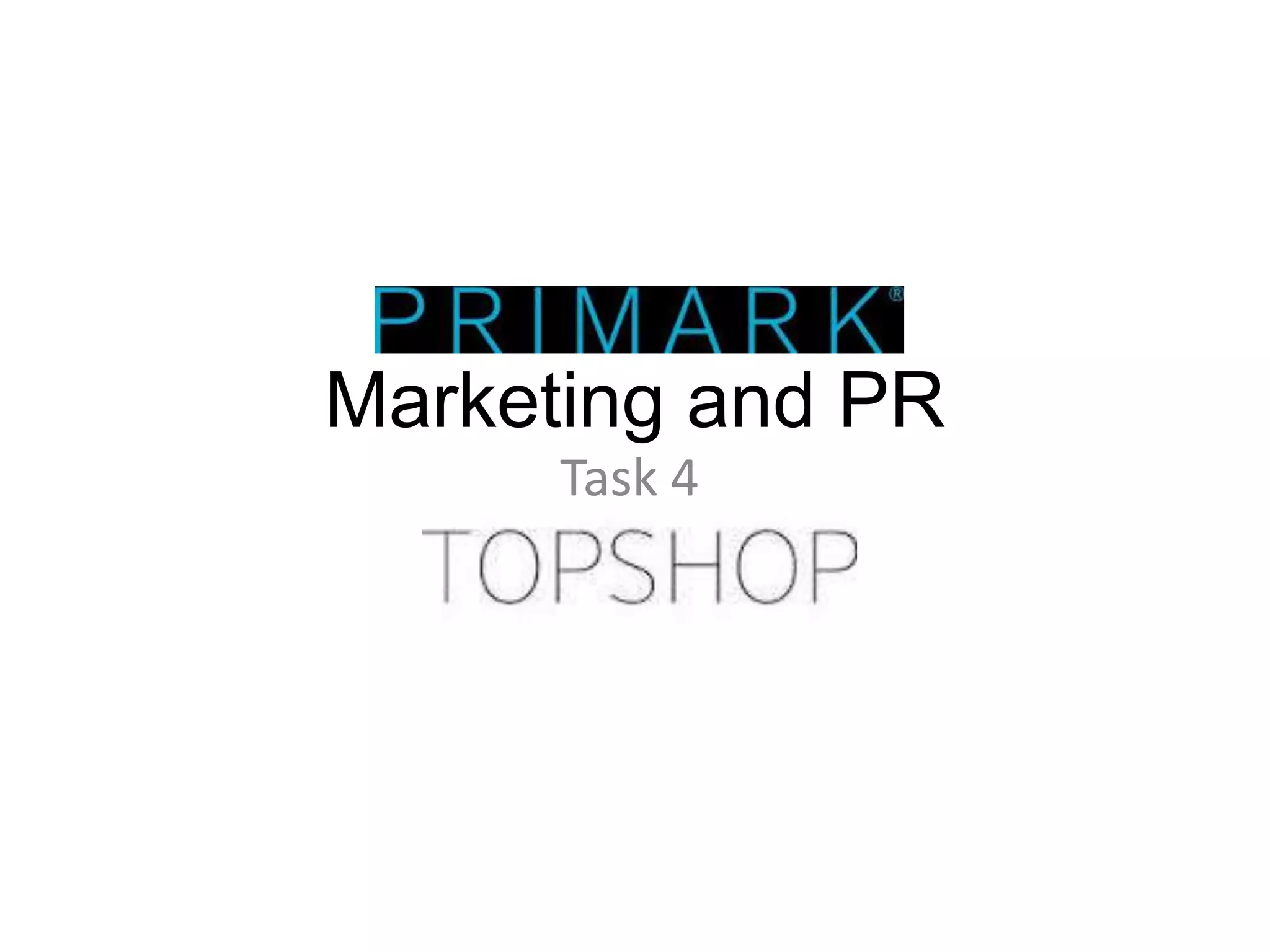 Topshop focuses on quality clothing for women ages 20-35 in well-paid jobs, emphasizing trends over price. Their advertisements portray an image of sophisticated, high-demand fashion through attractive photography and minimalist logos. Primark sells similar clothing at extremely low prices due to unfair labor practices. Their advertisements emphasize low prices over quality through plain photography, young models, and prominently displayed costs. While Primark clothing is known to be of poor quality and not last long, consumers continue shopping there for affordable fashion.