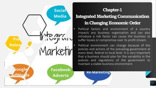 The document discusses various marketing concepts including integrated marketing communication, market segmentation, branding, digital marketing, customer relationship management, and sales. It explains that political factors can impact businesses and effective branding creates enduring customer perceptions. Market segmentation involves dividing markets into groups with common characteristics to create customized marketing. Relationship marketing focuses on loyalty and engagement rather than just sales.