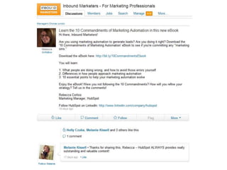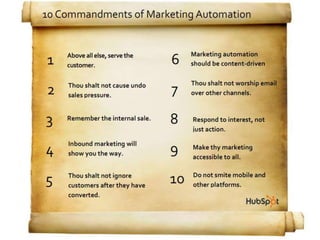 The document discusses the '10 Commandments of Marketing Automation' designed to improve customer engagement and marketing effectiveness. It highlights common mistakes in marketing automation, such as neglecting list maintenance and customer behavior changes, while emphasizing the importance of serving the customer and leveraging inbound marketing. Additionally, it promotes HubSpot as a comprehensive solution for marketing automation needs.
