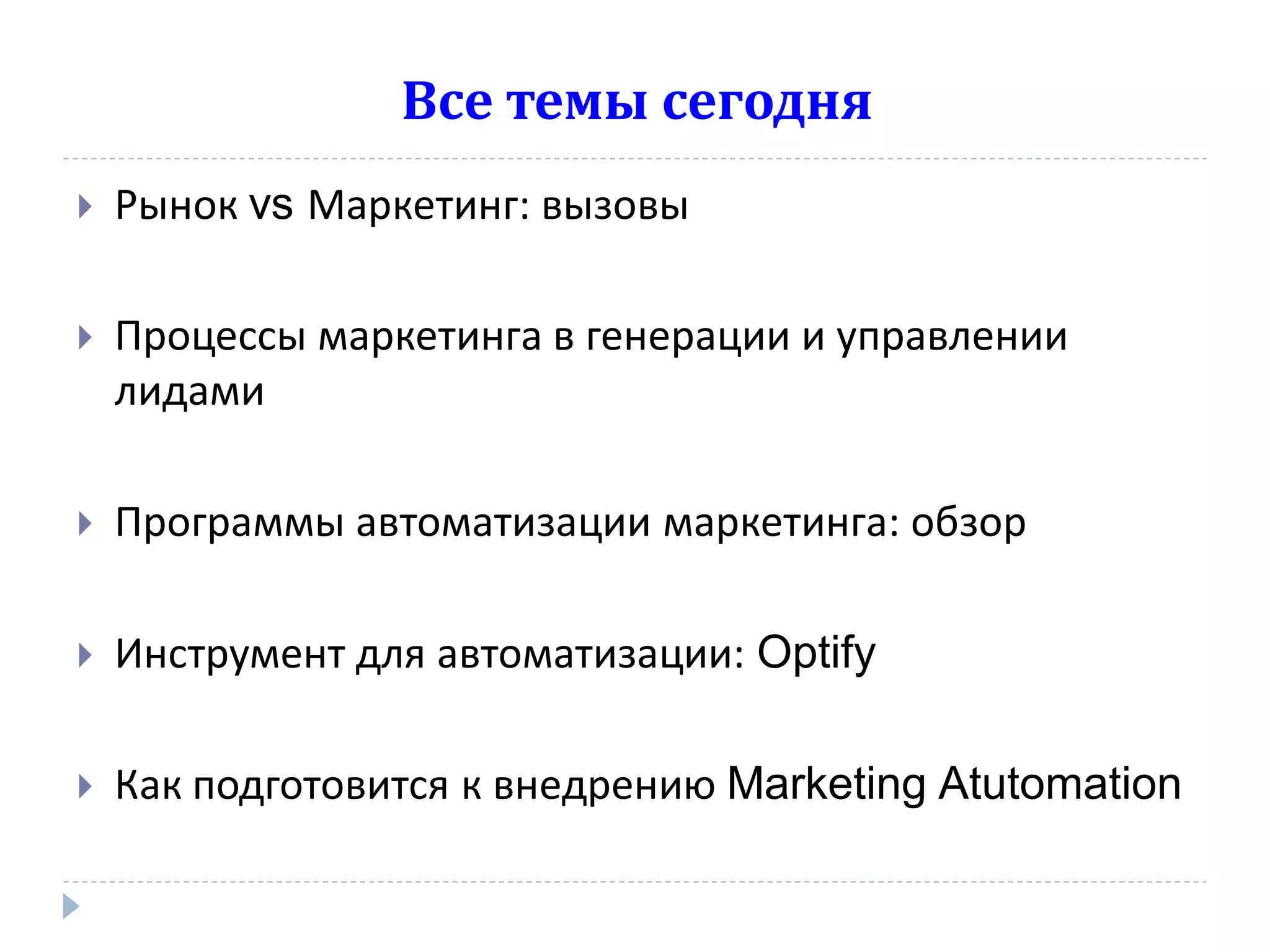 Документ рассматривает автоматизацию маркетинга и ее значение для бизнеса, акцентируя внимание на изменениях в поведении клиентов, вызванных интернетом. Основные вызовы включают необходимость генерации и управления лидами, а также адаптацию маркетинговых стратегий к современным реалиям, где традиционные методы становятся менее эффективными. Также подчеркивается важность ответственности маркетологов за результаты своих действий и эффективность процессов генерации спроса.