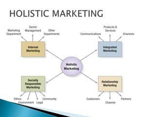 The document discusses key concepts in marketing. It defines marketing as a process of identifying and meeting consumer needs profitably through creating, stimulating, and fulfilling demands. Marketing involves understanding customers and the environment, developing strategies, implementing marketing programs, building relationships, and capturing value. The marketing mix of product, price, place, and promotion are used to create and deliver customer value. Marketing also requires understanding internal operations and external factors like competitors, suppliers, and the broader social, economic, technological environment.