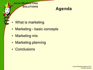2. It defines marketing according to several institutions and perspectives, and outlines the key elements of the marketing mix - the 7Ps of product, price, promotion, place, people, process, and physical evidence.