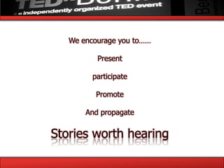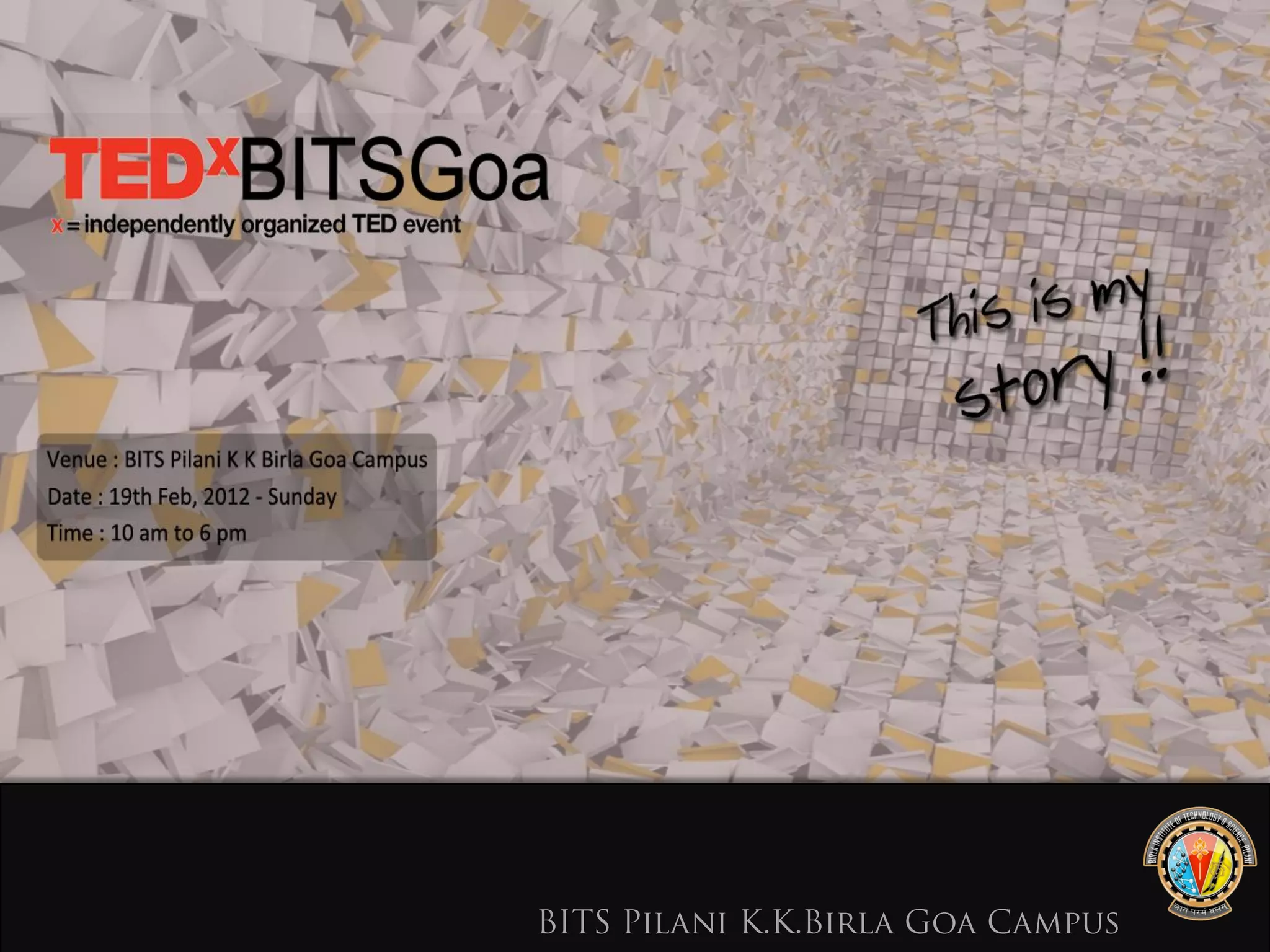 TedxBITSGoa is a local edition of the TEDx program, aimed at sharing impactful stories through speakers and discussions, under the theme 'This is My Story.' The event seeks to connect diverse individuals from various fields to inspire change and understanding through storytelling. Scheduled for February 19, 2012, at BITS Pilani, Goa, it provides an opportunity for corporate partnerships and community engagement in innovative ideas.