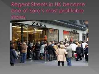 The document discusses Zara's business strategy of quick response times to changing fashion trends. Zara is able to move from identifying a trend to having clothes in stores within 30 days, unlike other retailers whose response time is longer. Zara focuses on short lead times to deliver more fashionable clothes, lower quantities to create scarcity, and more styles and choices. This approach keeps its stores stocked with what customers want currently and ensures clothes do not go unsold.