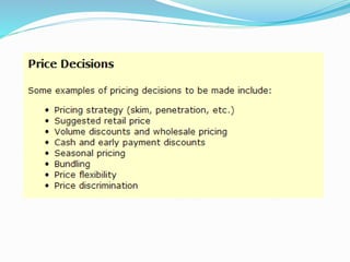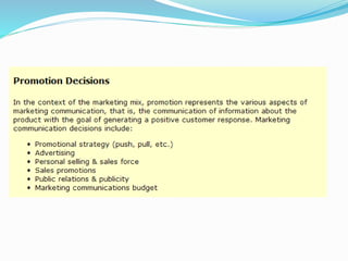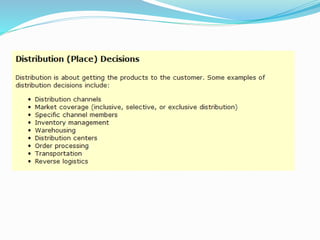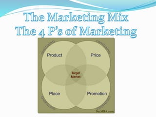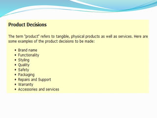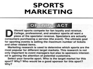 The document discusses various aspects of marketing including definitions, functions, target markets, calls to action, and sections on specific marketing areas like travel/tourism, sports, entertainment, e-commerce, and international marketing. It provides information on the 4 P's of marketing (product, price, place, promotion) and how they apply to different industries. Political, economic, sociocultural and technological factors that influence international marketing are also outlined.
