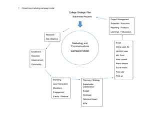 This document outlines the key components of a closed loop marketing campaign model for a college, including planning and strategy, stakeholder collaboration, budgeting, workload management, optimization of impact, setting key performance indicators, various digital and print marketing tactics, project management of schedule and execution, and reporting, analysis, and learning from campaign results. The overall goal is to generate leads, increase enrollment, retention, advancement, engagement, donations, and brand awareness through an integrated marketing approach.