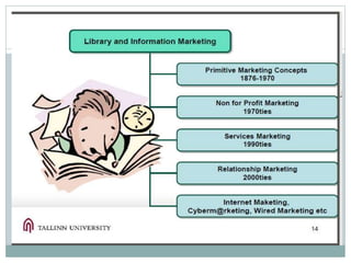 This document discusses marketing concepts and their application to libraries. It defines marketing and provides definitions from various experts. It explains why marketing is essential for libraries to maintain relevance and funding. The core concepts of market segmentation, positioning, analysis, programs, and audits are explained. Different elements of the marketing mix are described in the context of libraries. The document emphasizes that information marketing is important for university libraries to promote use of resources, create demand, ensure optimal use, improve image, and tackle issues like rising costs and information explosion.