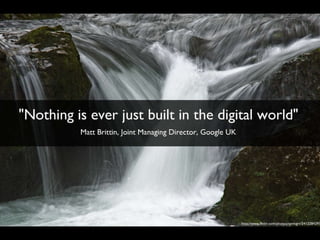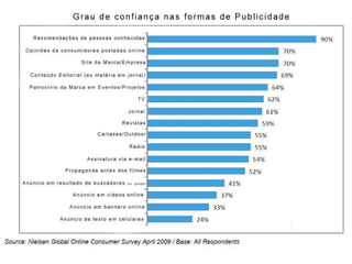 O documento discute as mudanças no marketing em um mundo digital, onde a internet se tornou uma mídia de massa e as pessoas passam mais tempo online do que assistindo TV. A conversação entre as pessoas online está substituindo a comunicação de massa tradicional e as marcas precisam participar dessa conversa para superar a crise de credibilidade e se conectar com os consumidores.