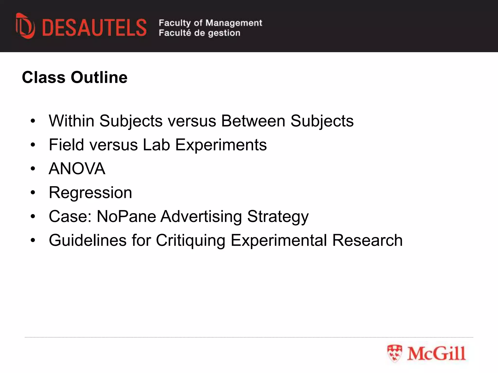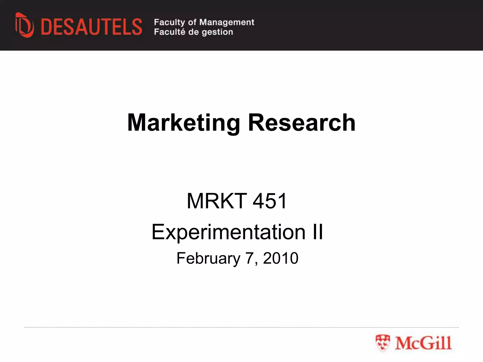 This document outlines an experiment conducted for a marketing research class. It discusses different types of experimental designs, including between-subjects and within-subjects designs. It also covers the trade-offs between field and lab experiments. Finally, it provides an overview of statistical analysis techniques like ANOVA and regression that can be used to analyze experimental data, including an example experiment involving different advertising themes and price levels.