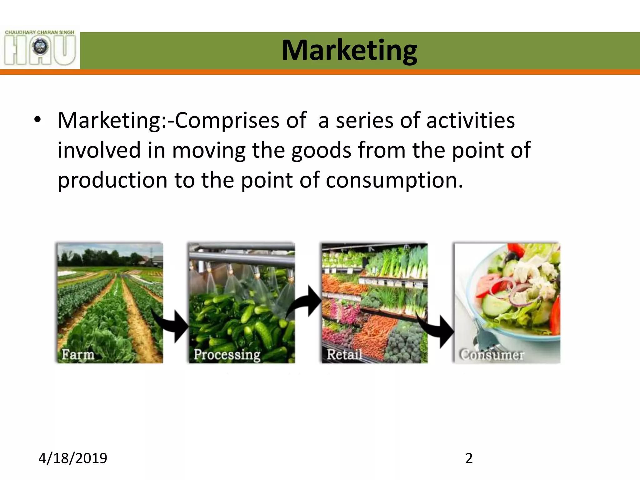 This document discusses several key marketing functions including packaging, transportation, grading, storage, processing, buying and selling, market information, and financing. It provides definitions and explanations of each function, as well as their advantages. For example, it explains that packaging protects goods, identifies brands, and reduces costs. Transportation widens markets and facilitates trade. Grading and standardization help farmers get better prices and consumers find quality products. Storage preserves goods and stabilizes prices. Processing changes raw materials into usable forms. Market information must be accurate, relevant and timely. Financing meets the capital needs of marketing agencies.