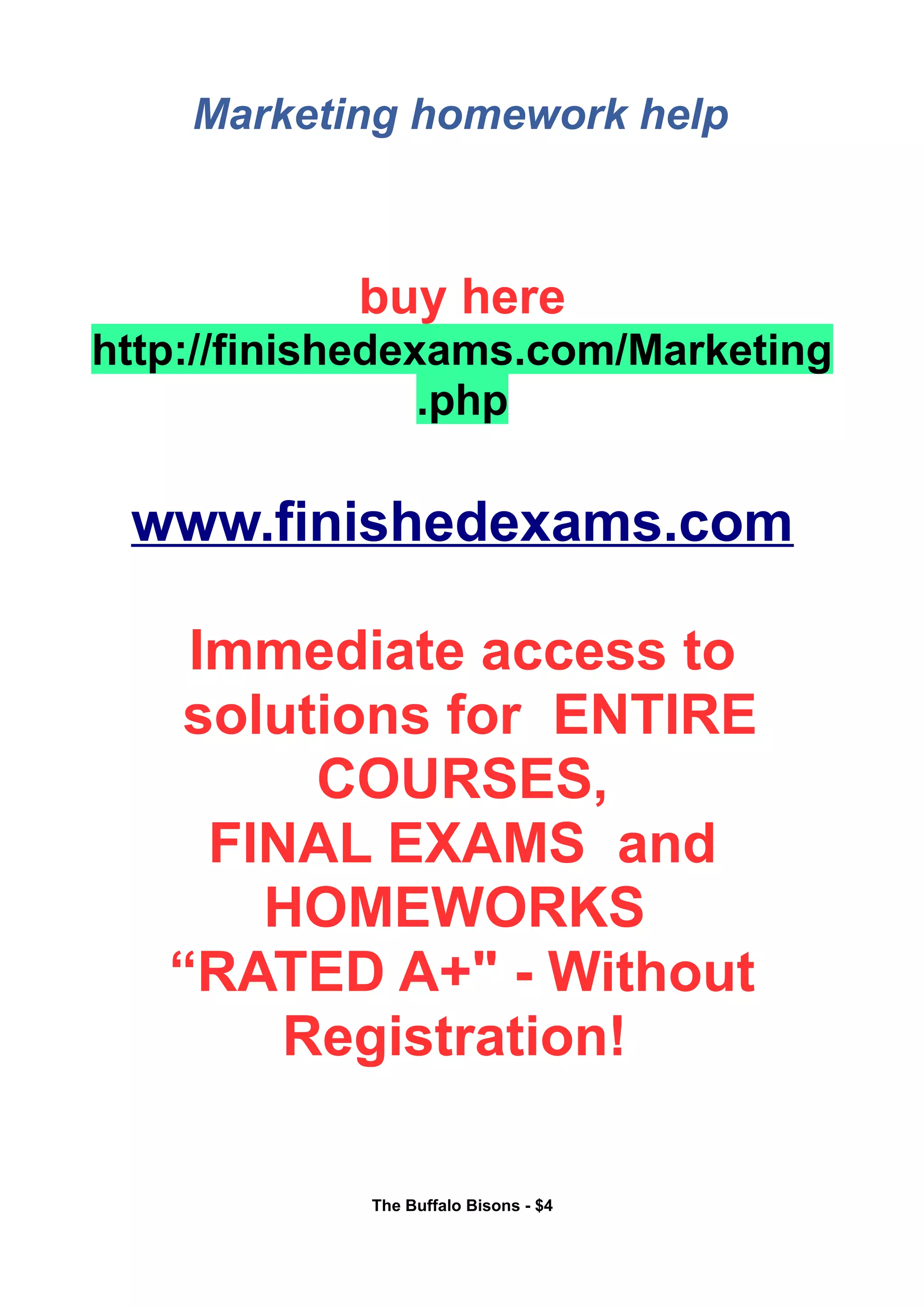 This document provides links to purchase homework help and exam solutions for various marketing courses from the website www.finishedexams.com. It advertises immediate access to homework and exam solutions for entire courses without needing to register on the site. The solutions are rated "A+" and the document claims the Buffalo Bisons, a minor league baseball team, has struggled with declining attendance in recent years despite past success filling their stadium. It provides a fictional account of a potential new sales incentive plan developed by the team's VP of Operations to try to increase fan engagement. Clicking the links would allow viewing additional details about marketing homework help services and sample sales plans being offered.
