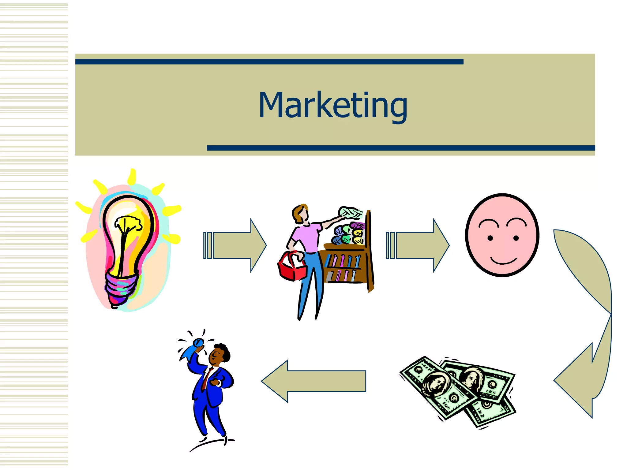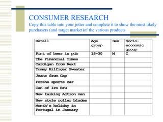 This document provides an overview of key marketing concepts including defining marketing, the marketing mix (4Ps), market segmentation, product life cycle, and methods of conducting market research. Marketing is defined as identifying, anticipating, and satisfying customer needs profitably. The role of marketing is to identify customer needs and provide desired goods/services to generate profits. The marketing mix consists of product, price, place, and promotion. Market segmentation involves dividing the market into distinct groups based on factors like demographics. Products go through different stages in their life cycle from development to decline. Market research can be primary research collecting new data or secondary research using existing data sources.