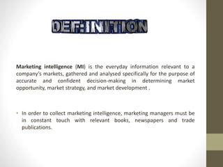 Marketing intelligence involves gathering everyday market information and analyzing it to make accurate decisions regarding market opportunities, strategies, and development. It is necessary for determining customer needs and preferences, understanding competitors, and entering new markets. Companies can improve their marketing intelligence by training salespeople to gather information, motivating distributors to share insights, researching competitors, gathering customer feedback, utilizing government data, purchasing external reports, and collecting online customer reviews.