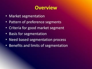 This document discusses various marketing strategies including market segmentation, mass marketing, micro marketing, and levels of micro marketing such as segment marketing, niche marketing, local marketing, and individual marketing. It provides details on criteria for good market segmentation, bases for segmentation including demographic, geographic, psychographic, and behavioral factors. Benefits and limitations of segmentation are also summarized. Overall, the document is an overview of key concepts in marketing management with a focus on market segmentation strategies.