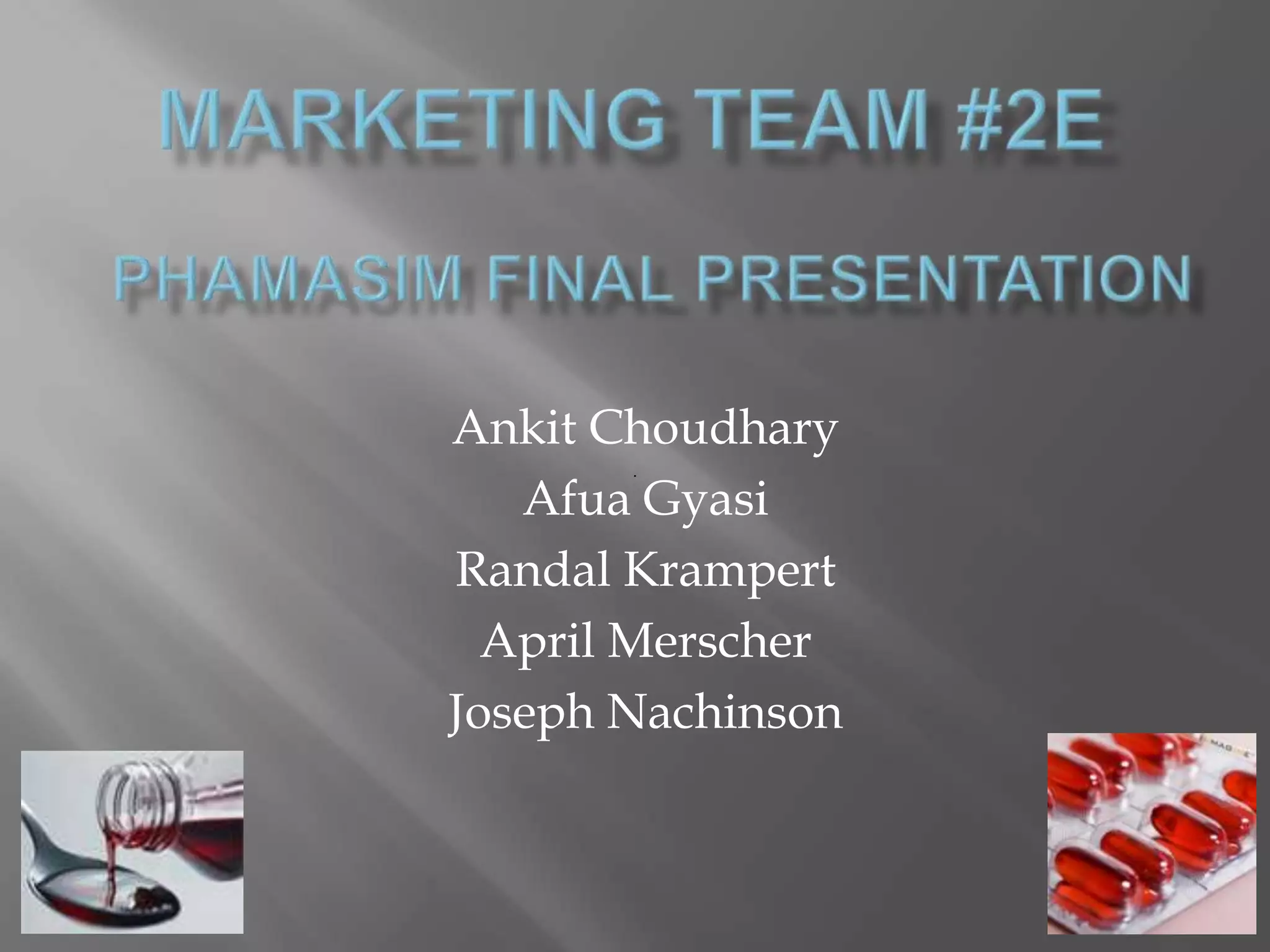 The marketing team presented a plan with short term goals of reformulating their main product and diversifying their product line, as well as increasing their sales force. Long term goals included increasing revenue, market share, stock price, net income and brand awareness. The plan outlined strategies for building brand image, fulfilling customer value, pricing, utilizing push/pull promotions, and allocating 40% of the budget to cold capsules, 30% to children's medicine, and 30% to liquid medicine. A performance summary showed an overall 16% increase in sales and significant increases in stock price and net income each round. The marketing plan involved a phased strategy starting with building channel relationships and market share, then maintaining relationships while increasing the sales force