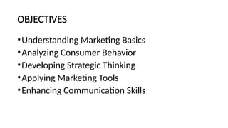 The document outlines the essentials of marketing management, including objectives, processes, consumer behavior, product management, pricing, promotion, distribution, and legislation. It emphasizes the importance of understanding target audiences, competitive pricing strategies, effective communication, and compliance with legal requirements. Additionally, it discusses the role of sales forecasting, distribution channels, and the influence of public policy on marketing practices.