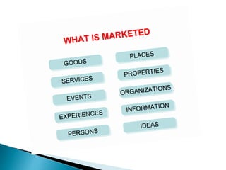 The document discusses the key concepts of marketing including definitions of marketing, the marketing concept, and the evolution of marketing philosophies over time. It provides definitions of marketing from various organizations and experts. It describes the progression from a production concept focused on mass production to a selling concept focused on persuading customers, to today's customer-centric marketing concept focused on satisfying customer needs. The functions, scope, and importance of marketing are also summarized.