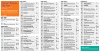 This document provides a summary of events taking place at Harbourfront Centre in Toronto from August 8-14. It highlights the Habari Africa Festival from August 12-14 which will feature African music, dance, film, crafts and more. It also lists various daily activities, including yoga, Tai Chi, movies, concerts, workshops and more happening throughout the week at different locations within Harbourfront Centre.