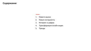 Документ обсуждает актуальные тенденции на рынке интернет-рекламы в Украине, включая рост объемов и новые инструменты для медийных кампаний. В нем также рассматриваются изменения в потреблении онлайн-видео и движение пользователей к мессенджерам как новой платформе для коммуникаций и рекламы. Кроме того, заметны влияния искусственного интеллекта и технологий виртуальной реальности на медиа-рынок.