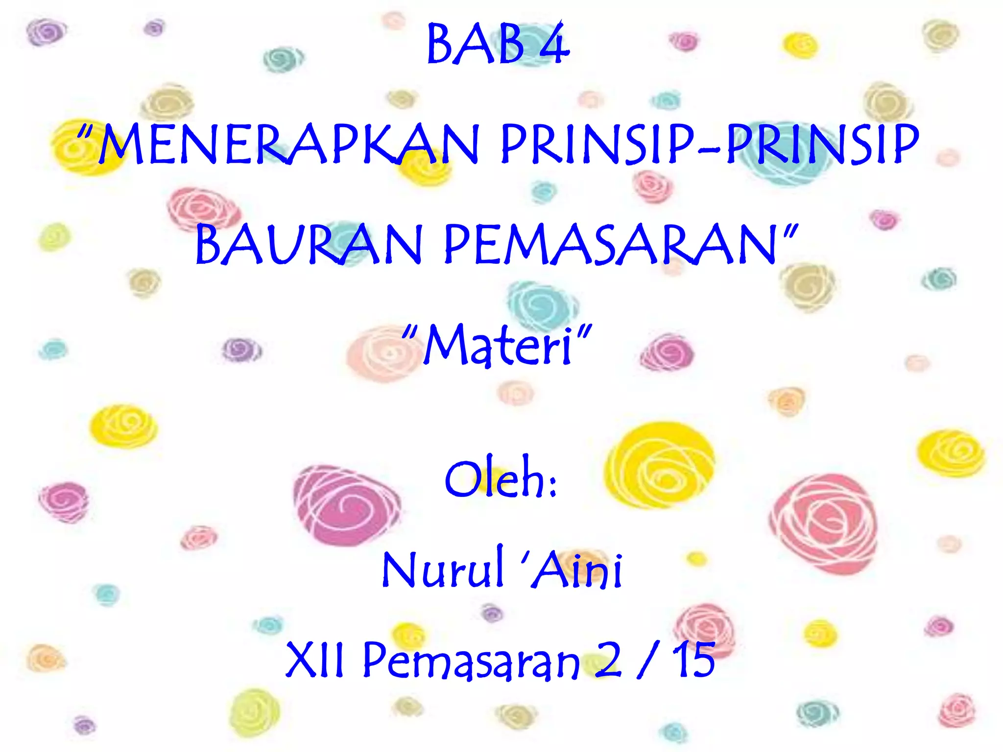 Dokumen ini membahas penerapan prinsip-prinsip bauran pemasaran (marketing mix) yang terdiri dari empat strategi utama: produk, harga, lokasi, dan promosi. Setiap strategi memiliki tujuan dan metode tersendiri untuk mencapai efisiensi pemasaran dan kepuasan konsumen. Penekanan diberikan pada pentingnya memahami kebutuhan konsumen serta bagaimana cara mengkomunikasikan produk secara efektif.