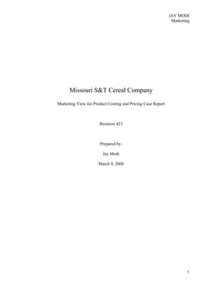 Missouri S&T Cereal Company is entering an oligopoly market in Hamburg, Germany with 3 existing and 3 new competitors. To differentiate itself, the company will target a niche market with unique cereal varieties and standard packaging. It will use skimming pricing for independent stores and cost-plus pricing for grocery chains. The company follows ABC costing and its major costs are advertising (fixed) and packaging (variable). The proposed prices are slightly higher than competitors to maximize profits for market expansion.