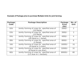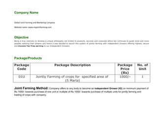 Global Joint Farming and Marketing Company offers independent growers (IGs) the opportunity to jointly farm crops through purchasing packages starting at Rs. 1000. IGs can earn tax-free income from crop harvesting over 10 periods as well as commissions from selling additional packages. The company closes packages and pays out earnings on specific dates each month. Key terms include that IGs must accept conditions on the company's website and the company has sole discretion over certain activities and decisions.