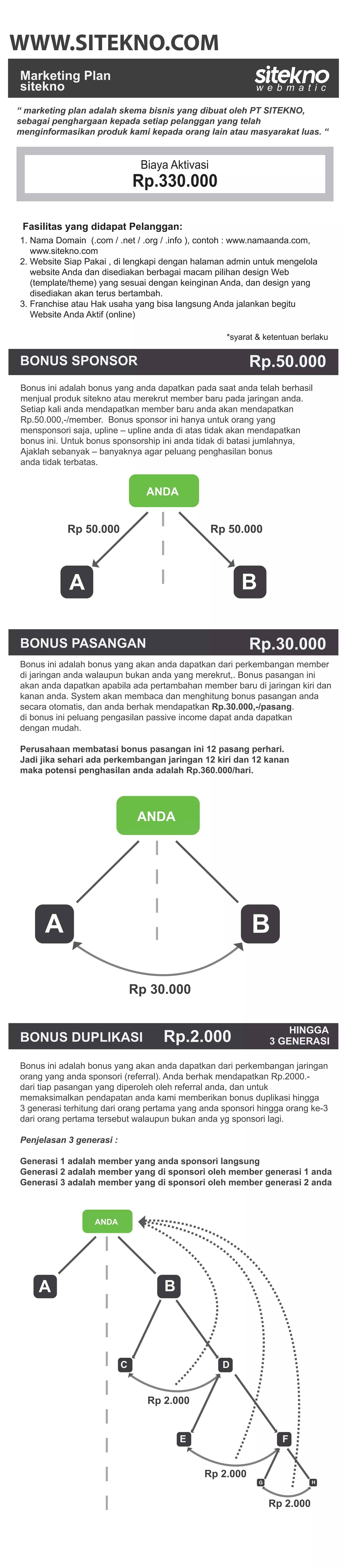 Marketing plan PT SITEKNO menawarkan bonus untuk pelanggan yang merekrut anggota baru, termasuk bonus sponsor, pasangan, duplikasi, dan renewal tahunan. Dengan merekrut dua anggota baru setiap bulan, pelanggan berpotensi mendapatkan penghasilan lebih dari Rp122 juta dalam setahun dari bonus pasangan.