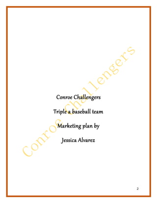 The document provides a marketing plan for the Conroe Challengers, a new Triple-A baseball team affiliated with the Houston Astros. It includes sections on the team's mission, goals, location, demographics of the area, business partners, branding strategy, target consumers, and stadium pricing plans. The team aims to become an integral part of the Conroe community by advocating for local charities and businesses and creating memorable experiences for fans.