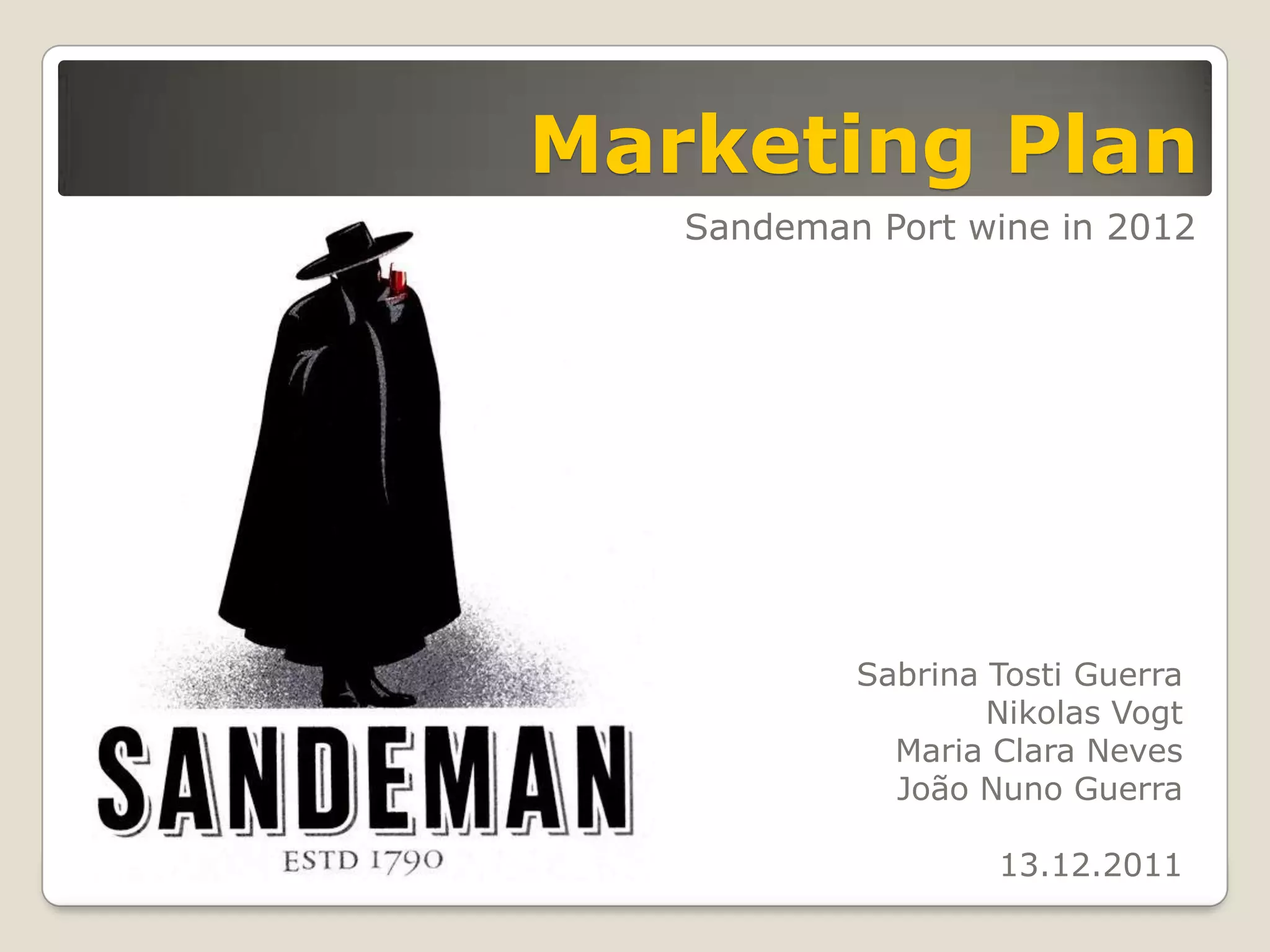 This marketing plan summarizes Sandeman Port wine's strategy for 2012. It begins with an analysis of the company's current situation and portfolio. An environmental analysis examines the declining Port wine market and competitive landscape. A SWOT analysis identifies strengths in brand and quality but also weaknesses in inconsistent marketing. Marketing objectives target a 10% sales increase through improved promotion. Tactics will use testimonials, events, and digital campaigns to build brand awareness and position Tawny Port as a premium experience product. Performance will be evaluated based on sales, market share, and brand loyalty metrics.