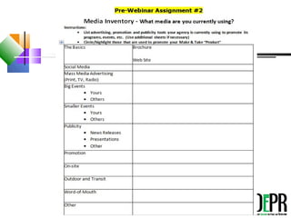 This document provides an overview of a webinar on developing a marketing plan. The webinar instructs participants to sign in, mute their phones, and download handouts. It then covers topics like defining marketing and its importance, the key elements of an effective marketing plan (product, price, placement, promotion, people), and how to incorporate the profession's brand promise. Participants are guided through exercises to outline components of their own marketing plan in 5 minutes for a specific product or service.