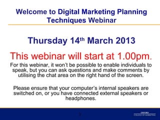 This webinar will provide techniques for developing an effective digital marketing plan. It will discuss understanding the planning process, setting objectives, analyzing the situation, developing strategies and tactics, and implementing the plan. Key aspects that will be covered include segmentation, targeting, positioning, the marketing mix, and setting goals and metrics to monitor performance. Barriers to planning and additional resources for digital planning will also be mentioned.