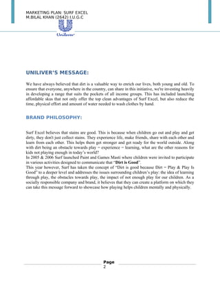 Surf Excel has been the dominant washing powder brand in Pakistan for 40 years. It aims to build loyalty through high quality and adapting to consumer needs over time. Unilever focuses on conveying the message that dirt is good for children through their advertising campaigns, which target mothers as the primary decision makers. Their marketing strategies include maintaining the "dirt is good" positioning through new TV commercials, expanding their target market beyond the middle class, and introducing new package sizes while providing discounts on bulk purchases to distributors. The objective is to continue growing sales and market share against competitors like Ariel.