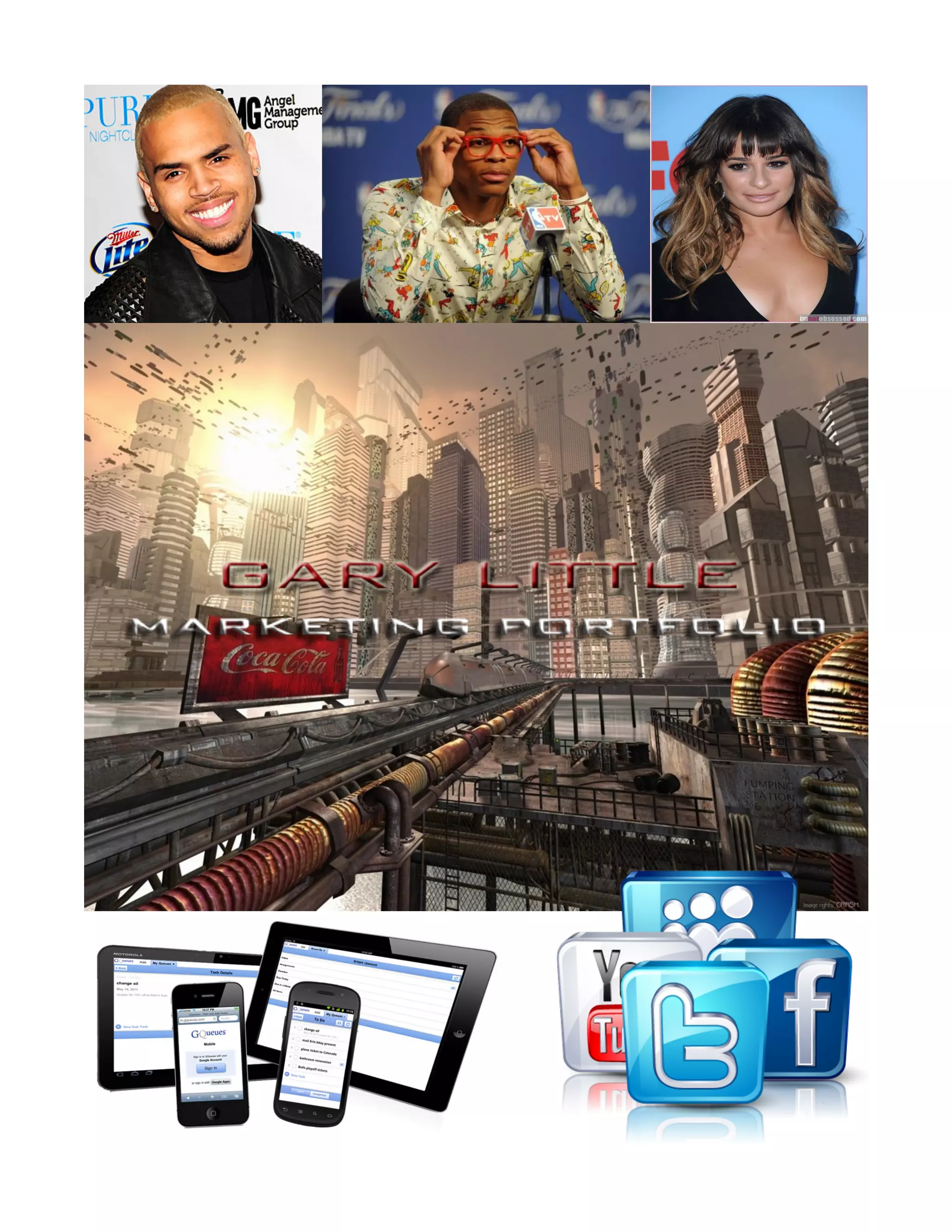 This document summarizes Gary Little's background and experience in marketing. It outlines his education at Fairfield University where he studied New Media and marketing. It then details his work experience managing marketing for sports and entertainment clients as well as a celebrity hairstylist brand. It provides examples of high-profile events he has planned and organized. Finally, it discusses his vision for the future of marketing and upcoming projects.
