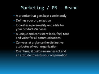 The document discusses the importance of branding for marketing and PR. It defines branding as a promise that is consistently kept and creates a unique personality for an organization. Key elements of branding include the brand name, position, promise, personality, tone, story, and associations. Successful branding requires determining the purpose and cost for different marketing vehicles, following a multi-step process, and keeping the brand consistent internally and externally.